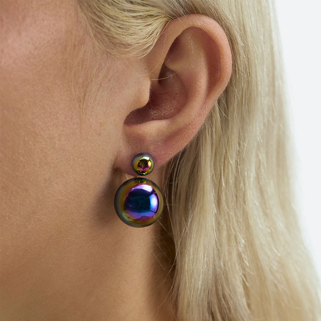 Boucles d'oreilles avec deux perles noire en résine, à l’irisation aux reflets bleutés sur le palladium ou violets sur le plaqué or.
