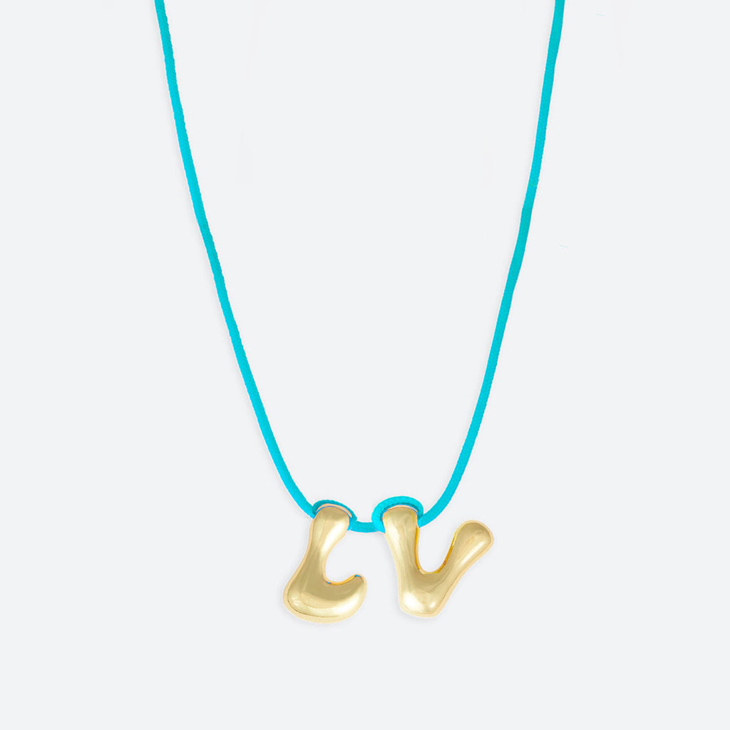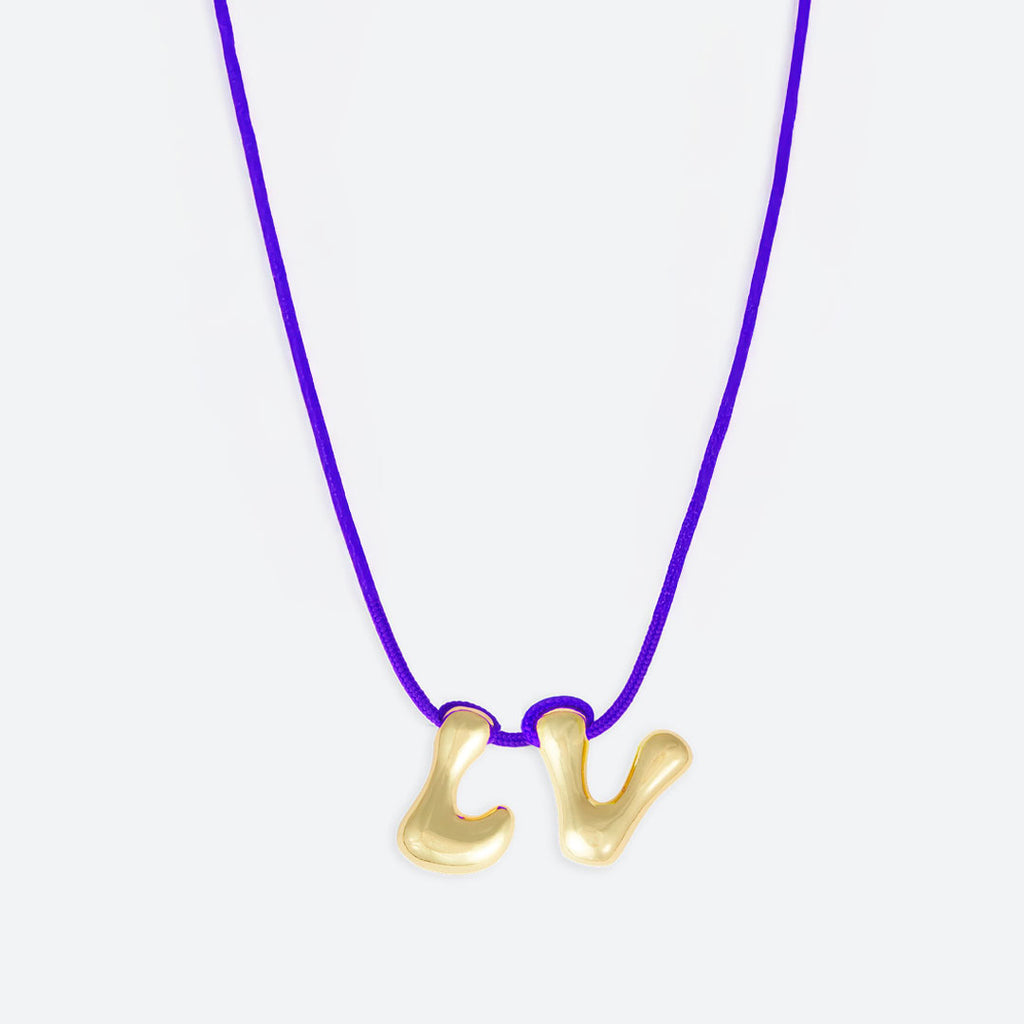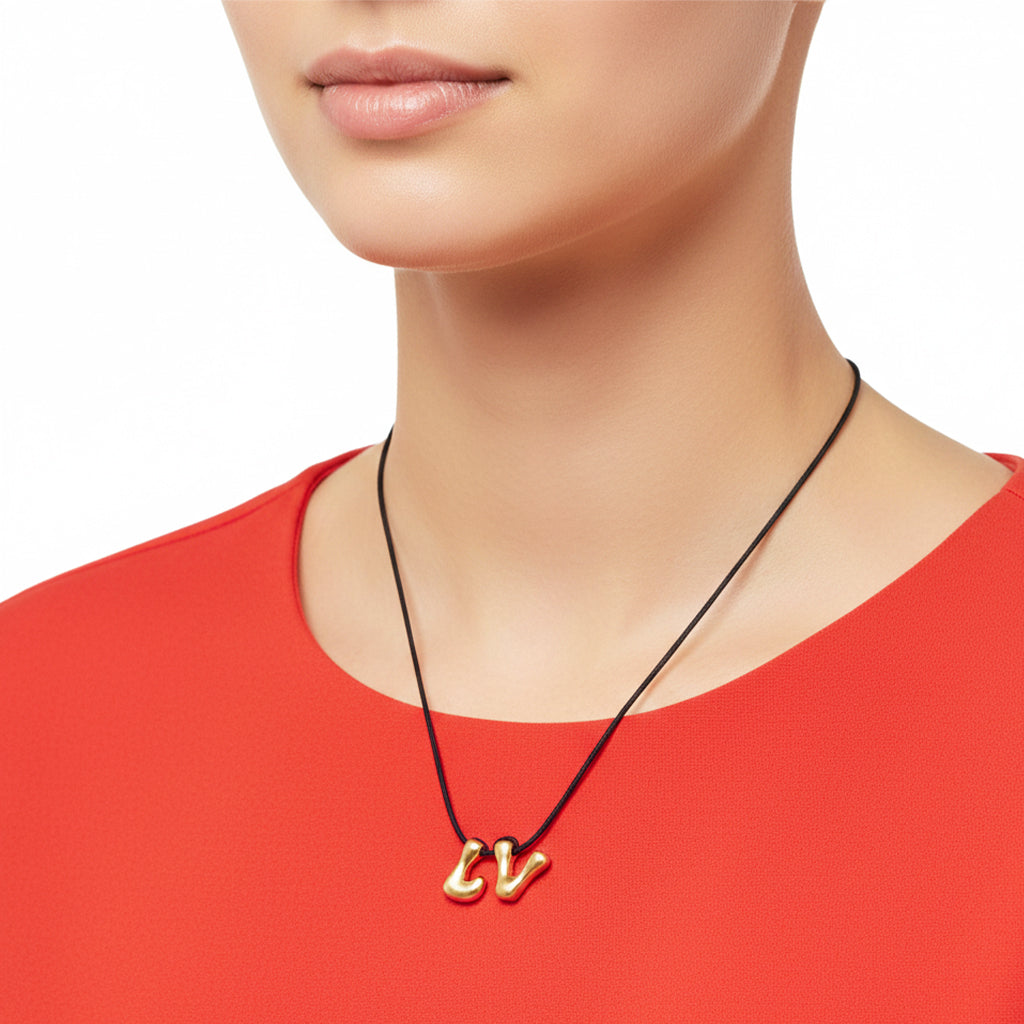 COLLIER AVEC DEUX PETITES LETTRES DORÉES, MONTÉES SUR UN CORDON AJUSTABLE.