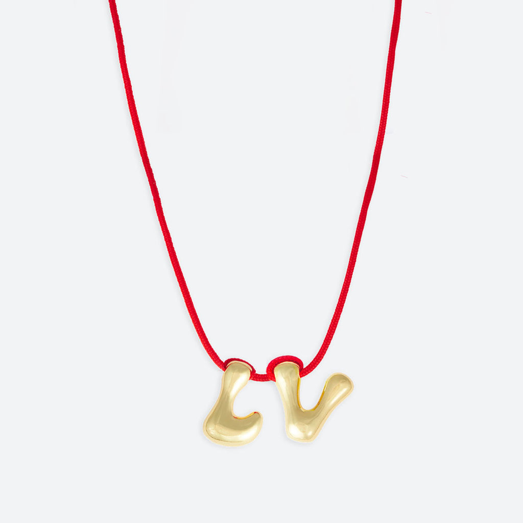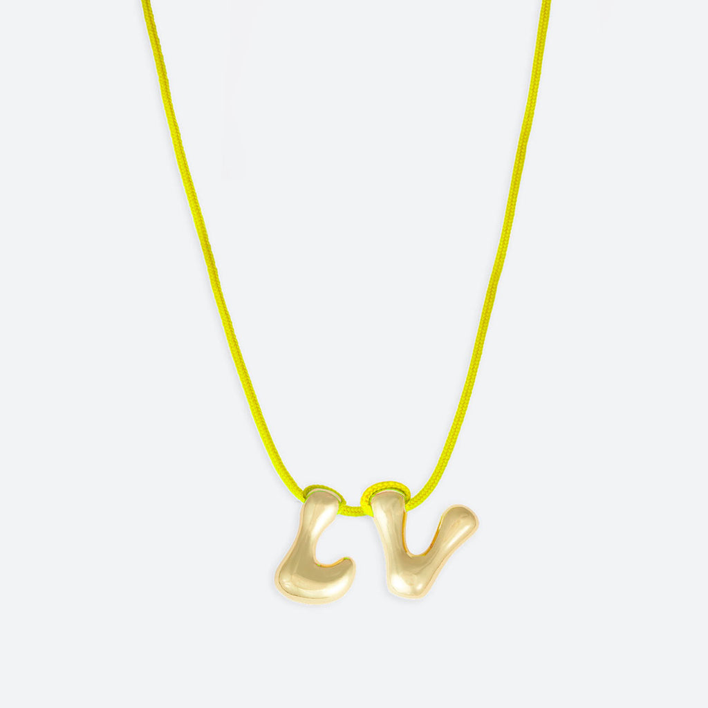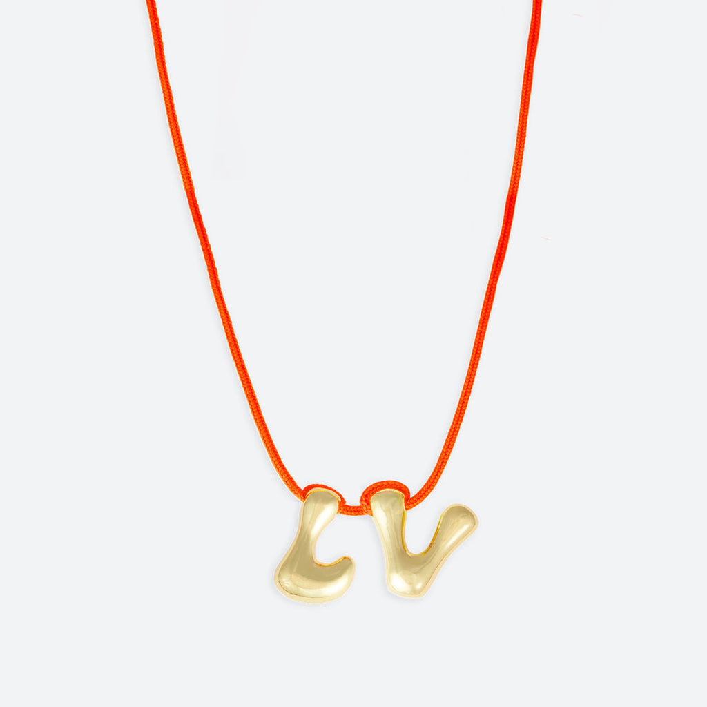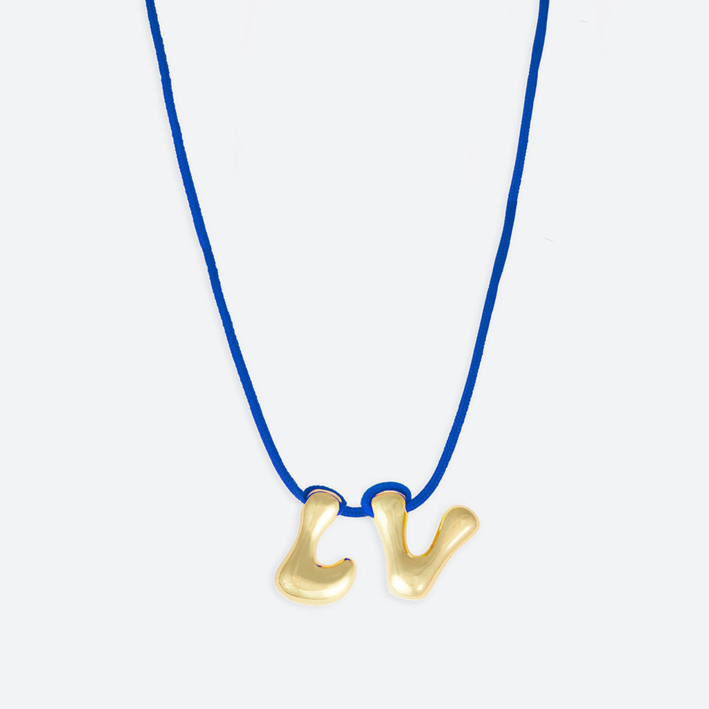 COLLIER AVEC DEUX PETITES LETTRES DORÉES, MONTÉES SUR UN CORDON AJUSTABLE.