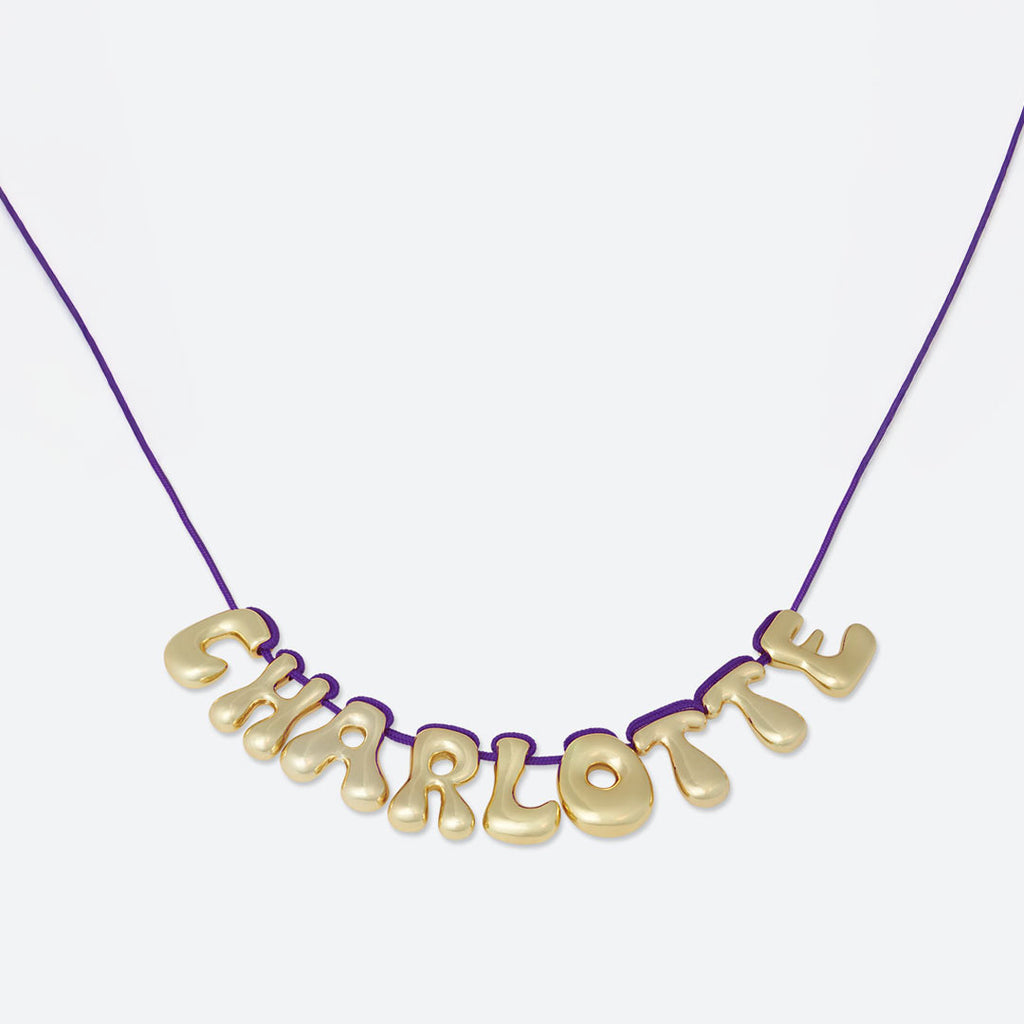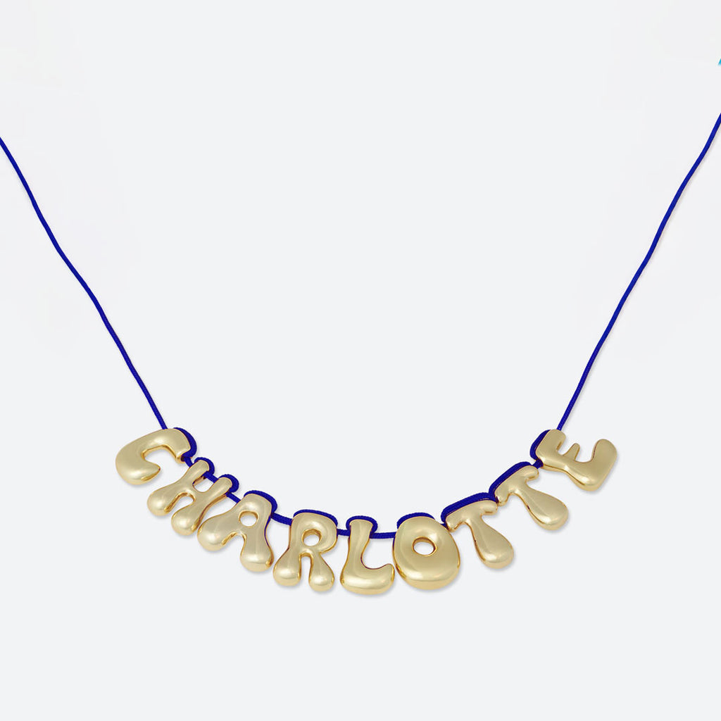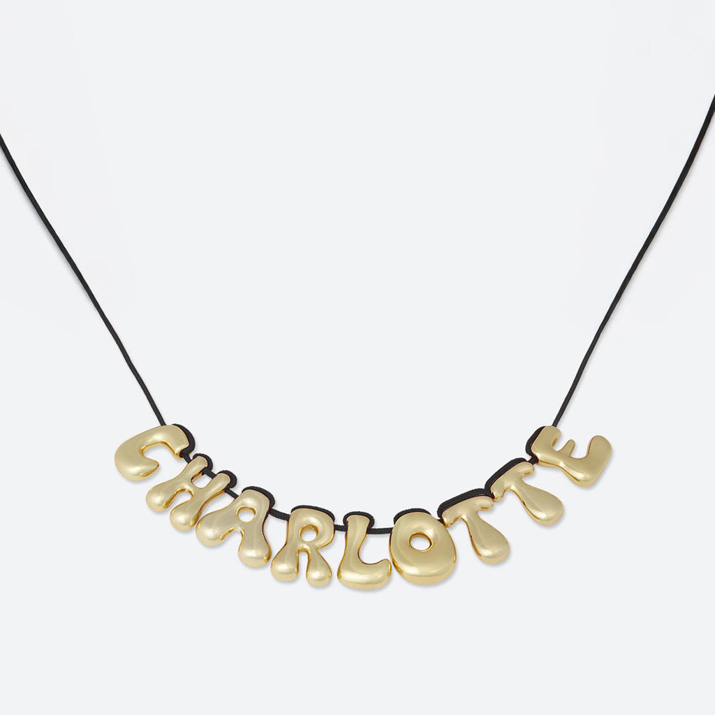COLLIER AVEC NEUF PETITES LETTRES DORÉES, MONTÉES SUR UN CORDON AJUSTABLE.
