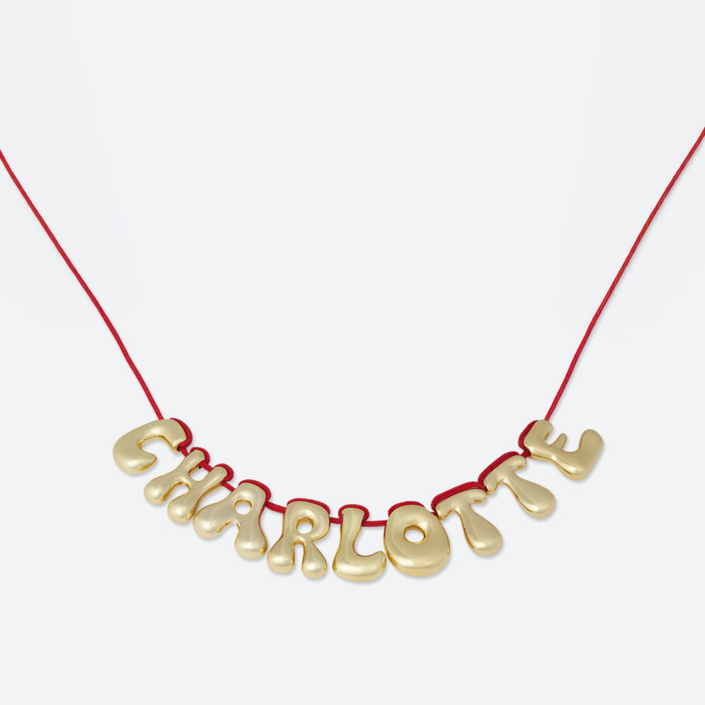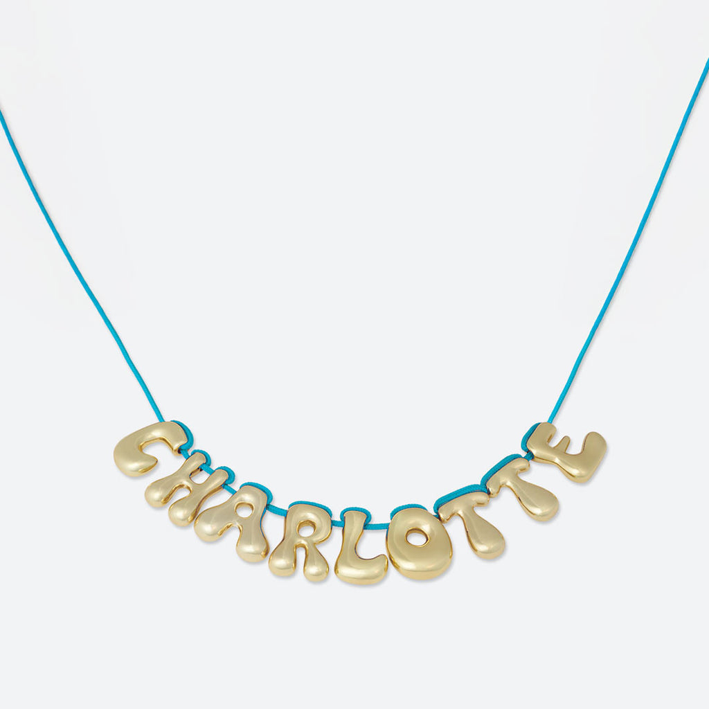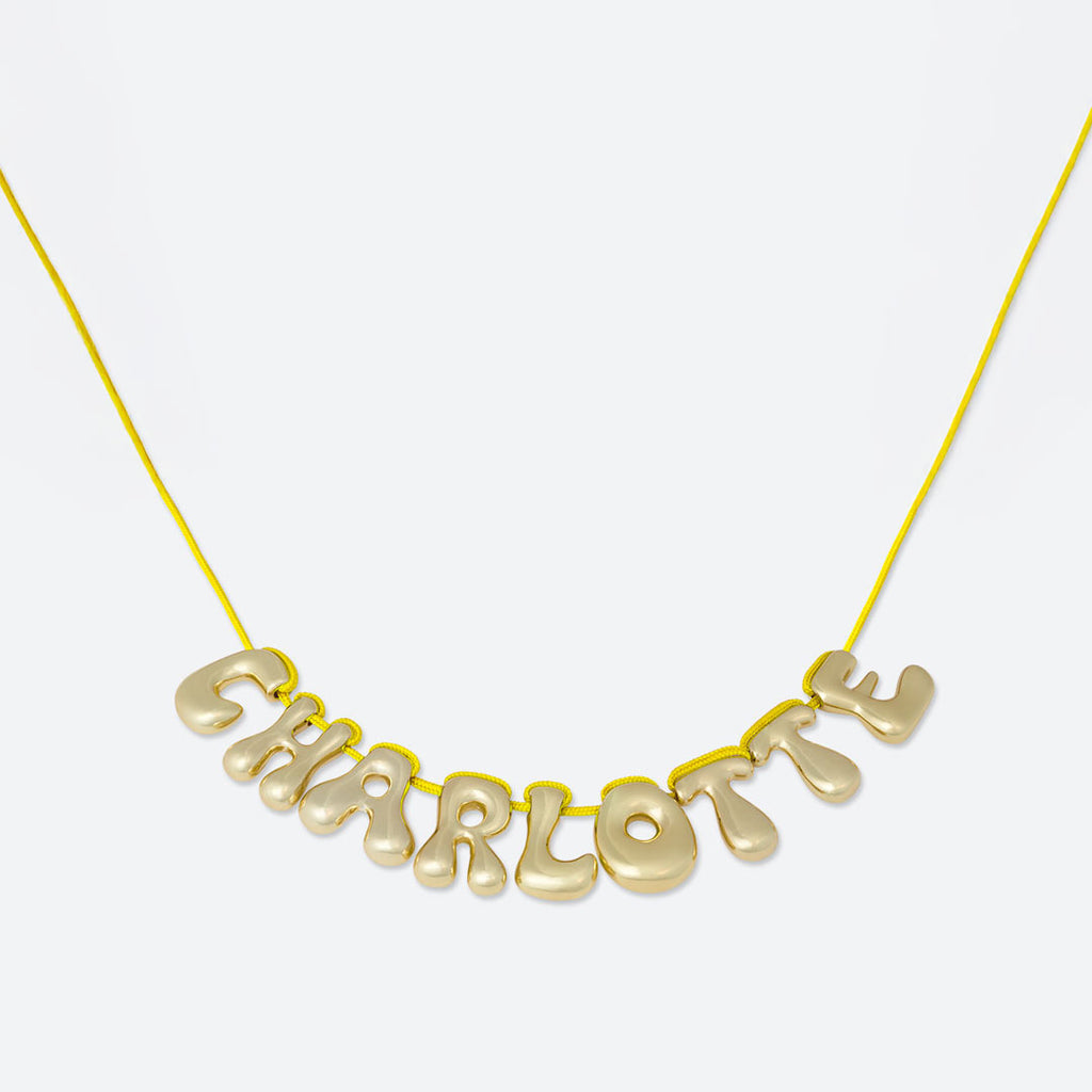 COLLIER AVEC NEUF PETITES LETTRES DORÉES, MONTÉES SUR UN CORDON AJUSTABLE.