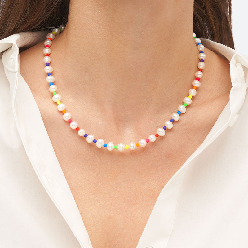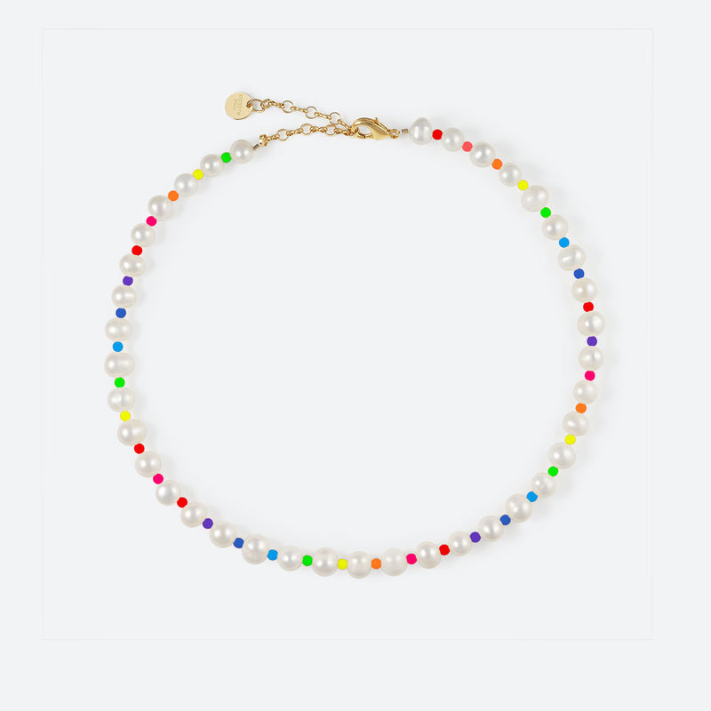 Tout bonnement sublime. Le coordonné des perles blanches avec les petites aux couleurs lumineuses en font un collier de toute beauté.