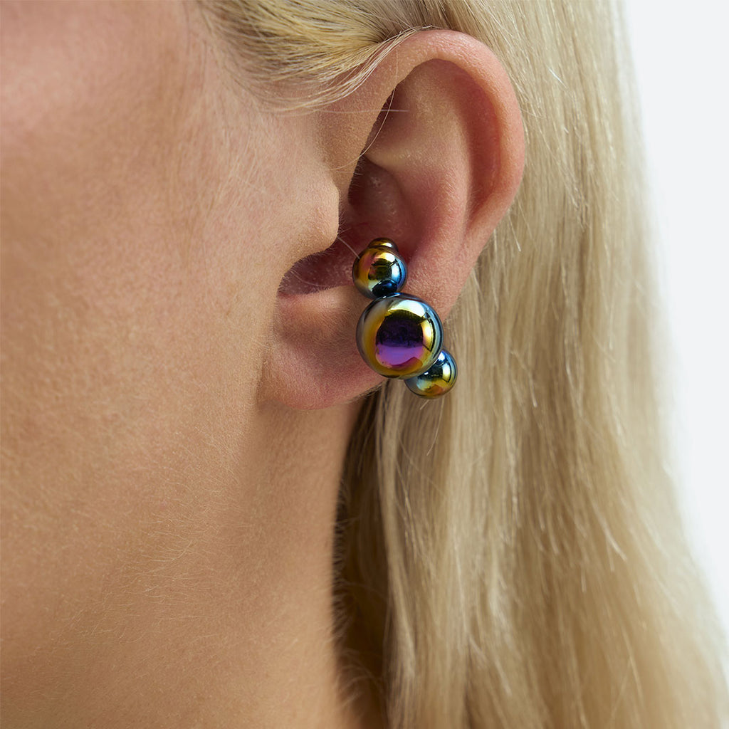 Mono boucle d'oreille "EARCUFF" avec 5 perles noires en résine, à l’irisation aux reflets bleutés sur le palladium ou violets sur le plaqué or.